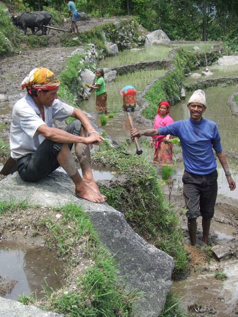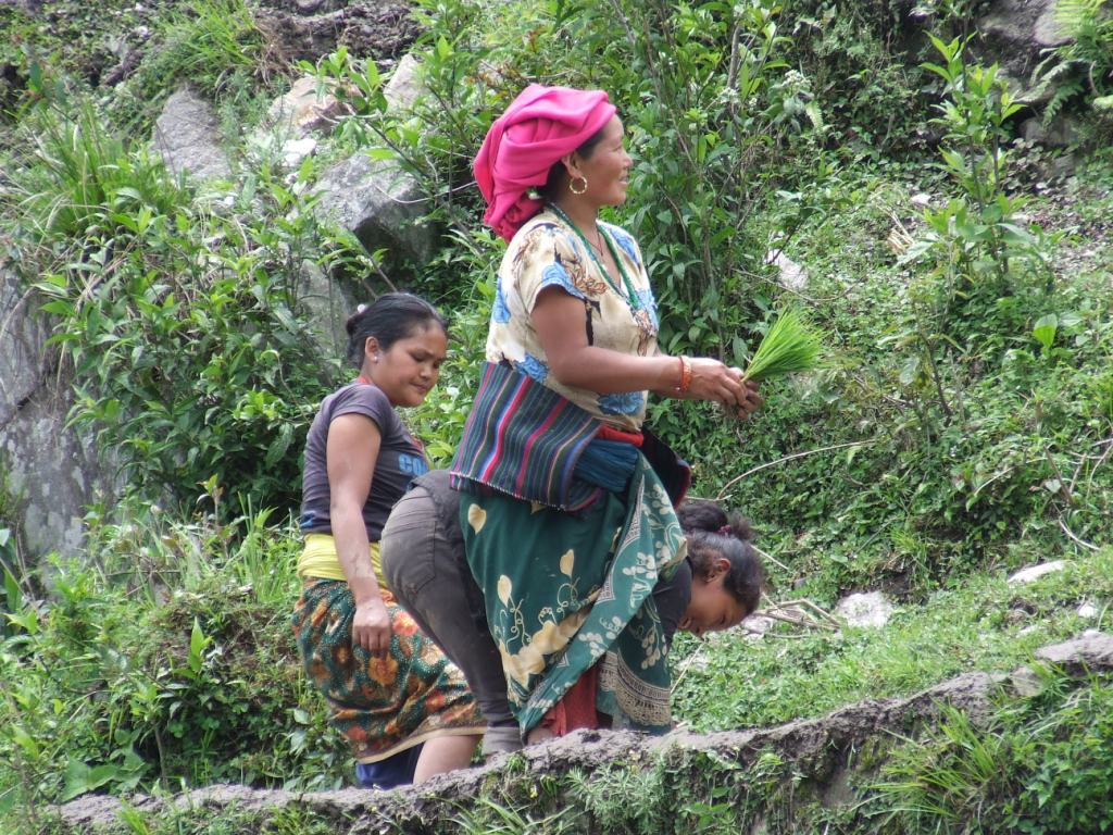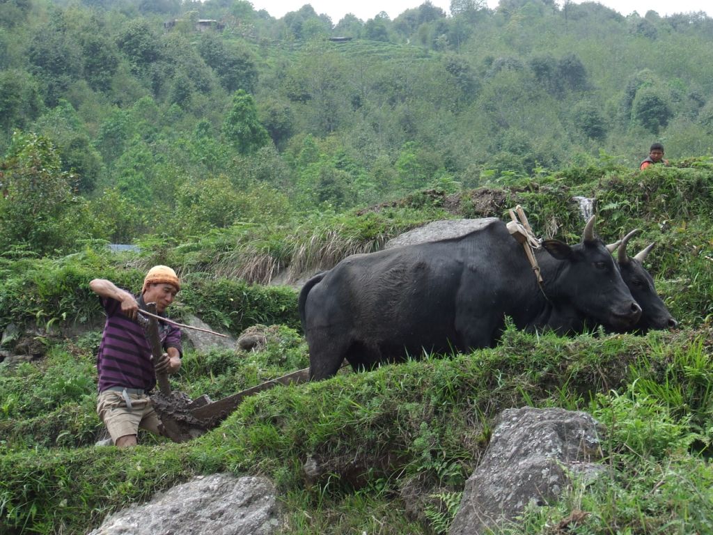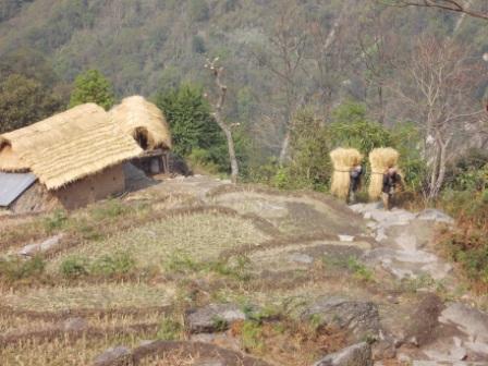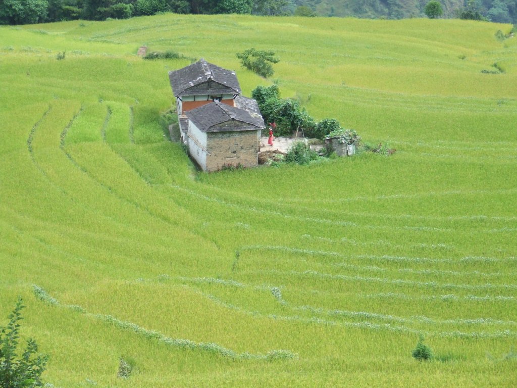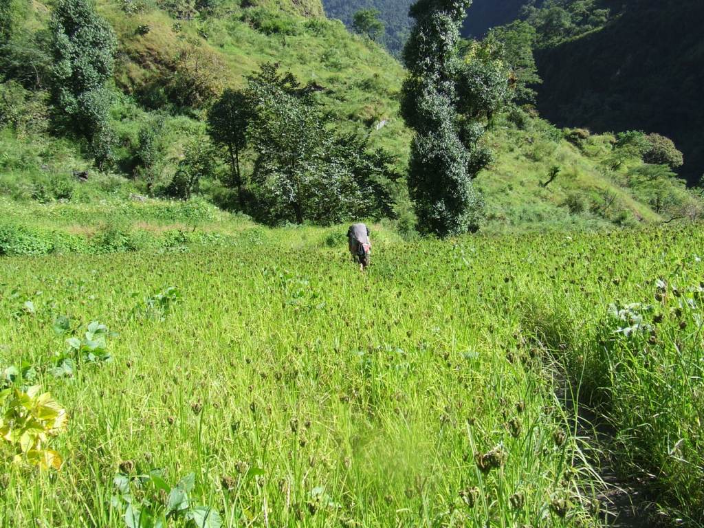 Tout a bien commencé avec un petit déjeuner digne du Khumbu. Sylvie est frappée brutalement par une tourista alors que nous avons à peine entamé la descente. Nous nous arrêtons en urgence. Le rythme de la marche s’en ressentira dans la journée. Nous attaquons le versant opposé en abandonnant le chemin principal pour éviter le centre de Gudel en déviant franchement sur la gauche. La traversée des petits hameaux est fort sympathique mais le chemin se perd souvent dans les terrasses des champs. Nous demandons plusieurs fois notre direction aux habitants, un peu surpris de nous voir passer là…