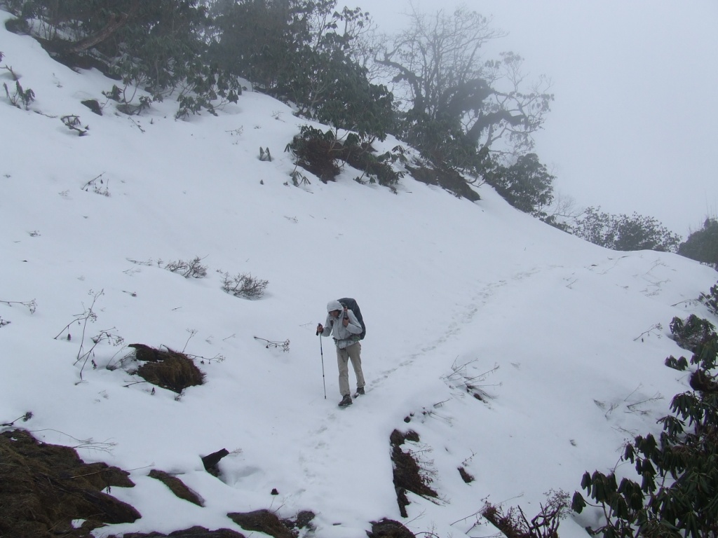 Lorsque le temps se calme, le ciel est totalement nettoyé. Un tapis de neige recouvre les alentours. Après le petit déjeuner, Sylvie n’est pas convaincue de continuer. J’ai décidé de continuer coûte que coûte, maintenant si près du but. Elle devrait alors descendre seule jusqu’à Taksindu la. La perspective de la traversée de la forêt lui fait changer d’avis.