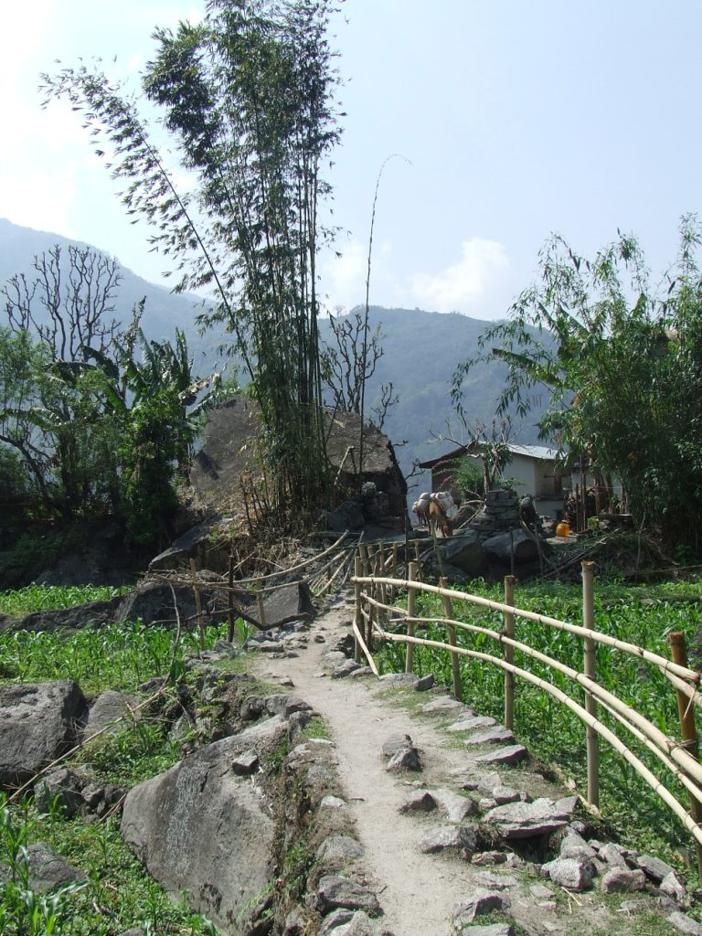 Nous traversons de très beaux villages et il n’est pas rare de trouver de petits restaurants. Il commence à tomber une pluie fine vers 9h30 qui s’arrête assez rapidement. Le chemin est agréable et nous déjeunons à Kattike, de l’autre côté de l’Arun. Nous y apprenons qu’il y aurait 3 jeeps par jour jusqu’à Ghote bazar (aller simple à 500 Rs?). Les seules jeeps que nous voyons ont le capot grand ouvert et semblent avoir rendu l’âme. On ne sait d’ailleurs pas d’où elles viennent. Nous continuons à pied et, comme toujours lorsqu’une route vient d’être ouverte, la piste est difficile à trouver. Suivre la route reviendrait à faire des détours considérables.