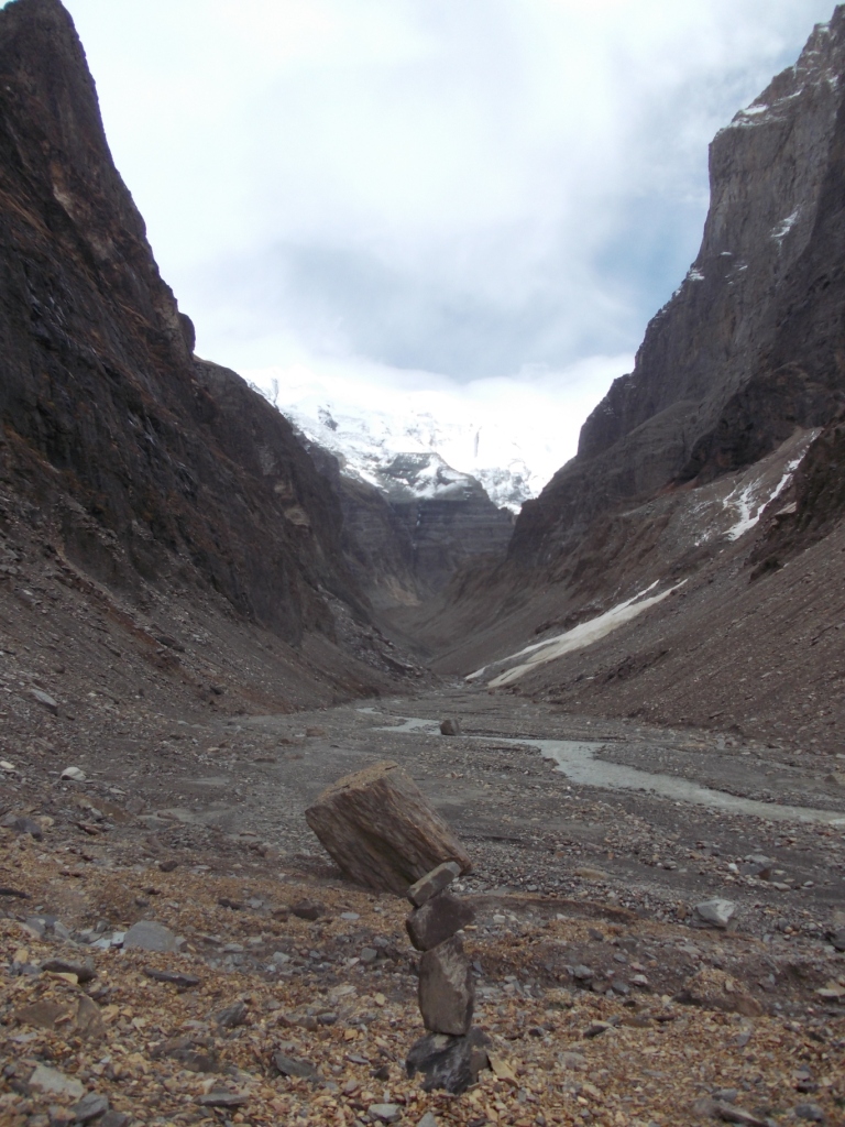 Un panneau rouillé indique Sanam et une habitante nous recommande de poursuivre la route dans cette direction. Nous préférons continuer par la vallée pour éviter un nouveau col, inutile. Le chemin de la vallée est moins emprunté et plus difficile à suivre. Le temps reste beau jusque 14h30, au moment où un chilien nous double comme un bolide. C’est notre premier trekkeur en 4 jours et même le premier depuis que nous sommes dans le Makalu.