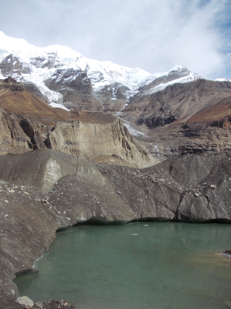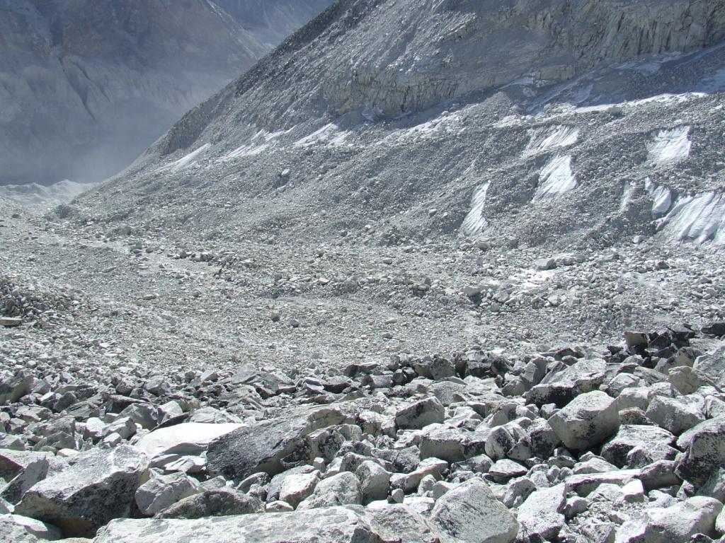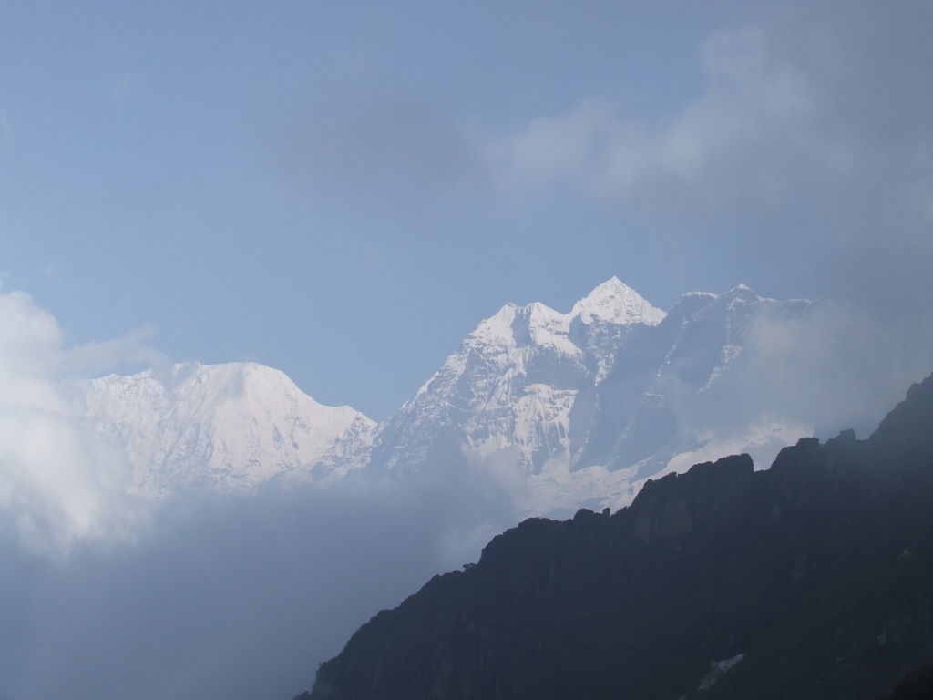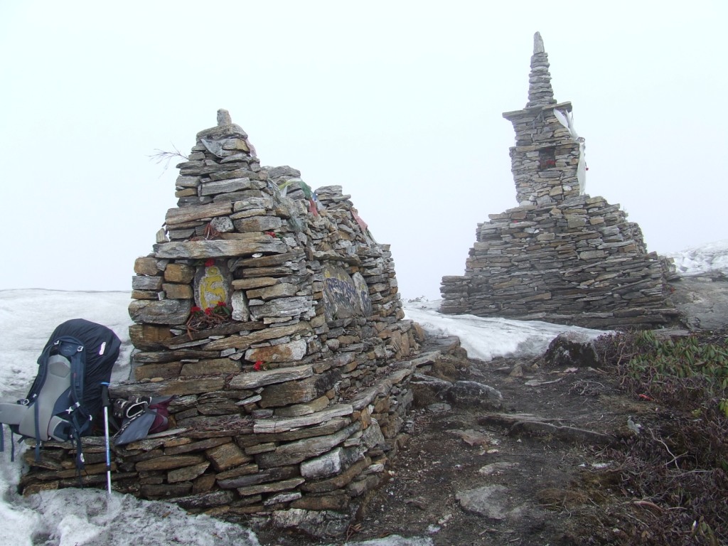 Le temps se bouche rapidement avec la montée des brumes provoquées par la chaleur des premiers rayons du soleil. Il se met à neiger mais il n’y a pas d’orage. La brume se retire de temps en temps pour nous faire apercevoir des sommets majestueux et des falaises gigantesques, si proches maintenant. Nous arrivons à Dudh Kund exténués. Surprise! il n’y a pas de lac mais un alignement de murs bas. J’ai oublié que le lac est plus au Nord. Il faut continuer…