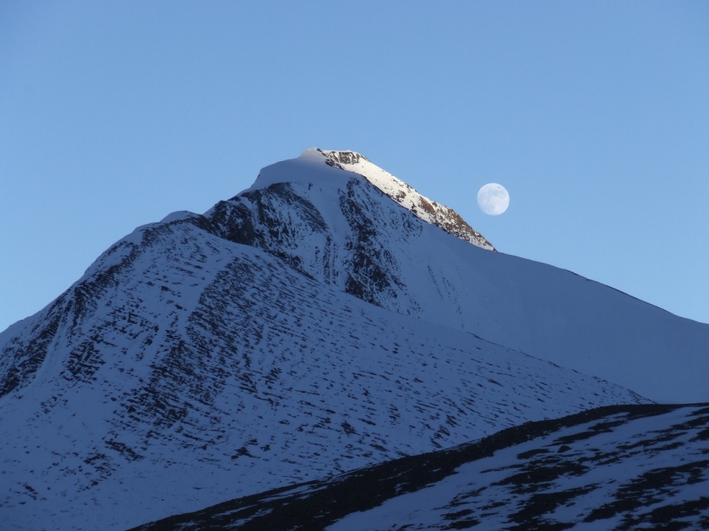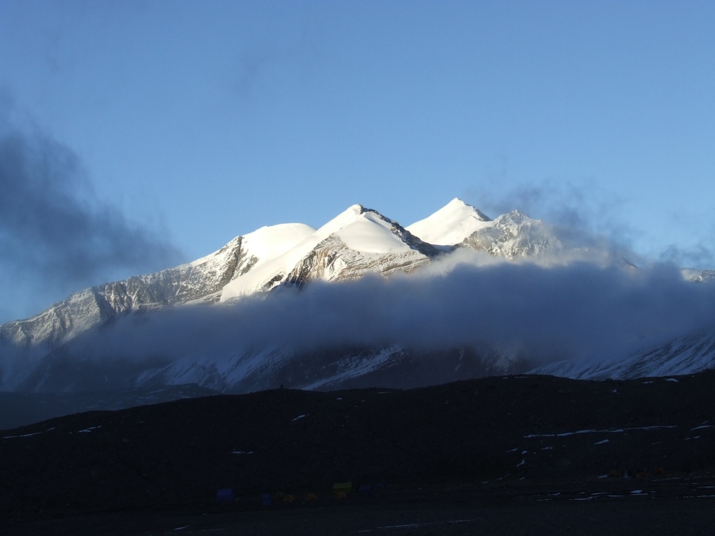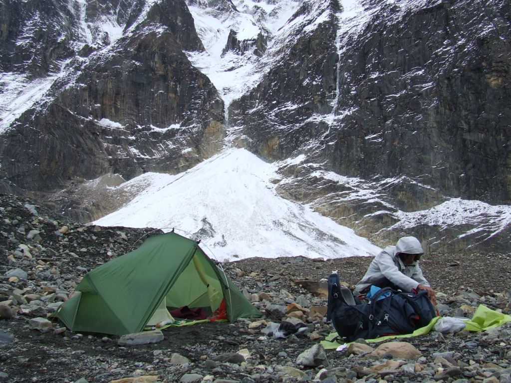 La pluie s’était arrêtée dans la nuit pour reprendre de plus belle. Elle est accompagnée de rafales de vent puis de neige. C’est une vraie tempête. La température chute brutalement. Nous craignons que la tente ne s’envole et que les sacs, protégés par les ponchos, ne tombent dans le ravin. Je me lève avant le lever du jour pour vérifier l’installation. Le spectacle est dantesque avec un quartier de lune et quelques étoiles apparentes dans des pans de ciel dégagé, et, au loin, les grands massifs maintenant découverts, surplombés d’une couche noire, inquiétante. J’enlève la neige qui s’accumule sur le double toit, faisant se toucher les deux parois. Je me recouche en espérant que la tempête cesse rapidement.