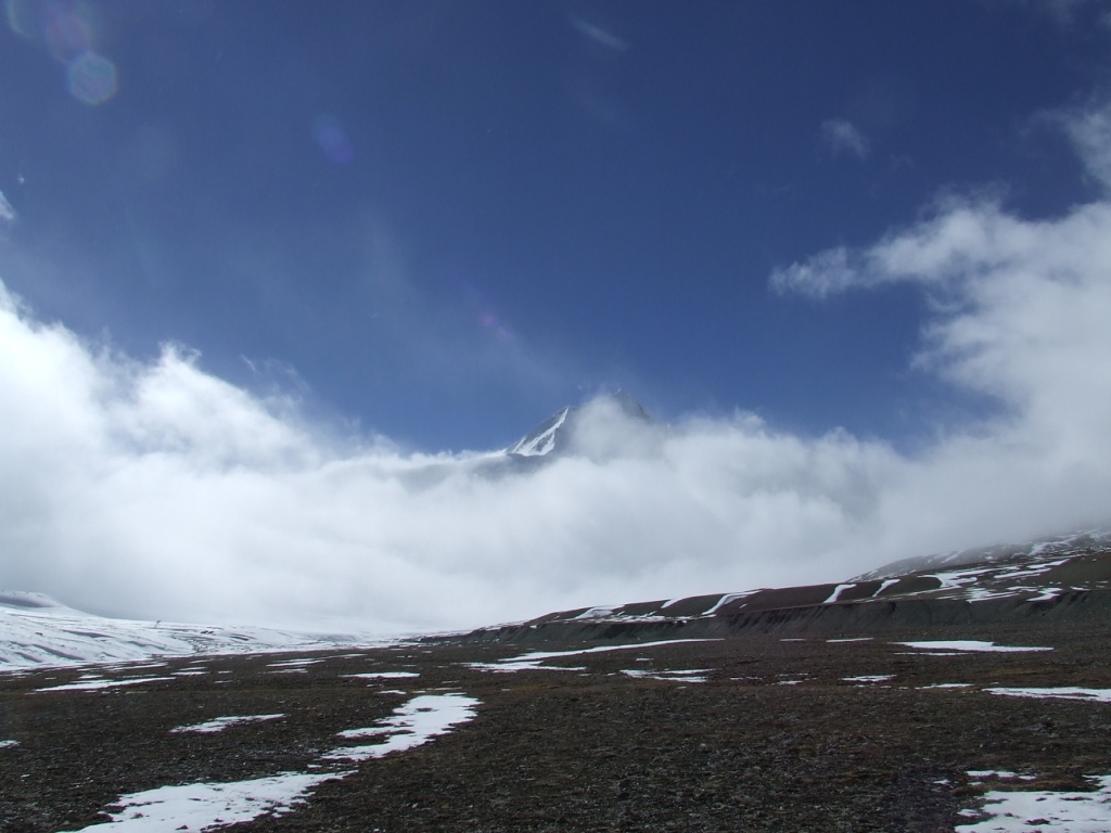 Nous n’avons plus qu’un litre d’eau et nous découvrons, à la place du lac, une cuvette totalement sèche sur un lit sablonneux avec quelques cabanes WP65. Il est presque 15h. Impossible de rester. Un passant nous indique que Salpa est juste de l’autre côté d’un col presque vertical. Nous voilà repartis. Contre les indications du GPS, le lac se trouve de l’autre côté du col, atteint en une demi heure. Il est encaissé et n’offre aucun panorama. Des ouvriers travaillent à l’aménagement de ses berges sacrées. Il est envahi par les brumes et ne donne pas envie d’y établir un campement.