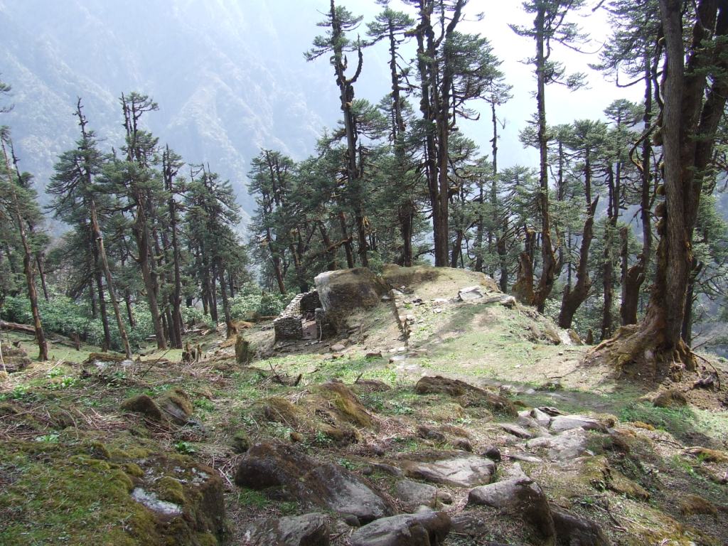 Nous avons fait à peu près la moitié du chemin jusque Dudh Kund quand nous trouvons un lieu correct pour un campement. Il pleut toujours et nous montons la tente dans des conditions difficiles. Il nous faudra nous contenter de l’eau qu’il nous reste car nous n’avons pas encore trouvé de source sur le chemin.