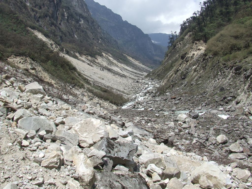 A mi chemin (lieu dit Kharka sur la carte), nous dévions sur la droite, selon les conseils de plusieurs passants et contre l’indication du GPS. Cette déviation nous fait passer par le lac alors que la carte prévoit qu’il est en retrait de la voie principale. Celle-ci a peut-être disparue dans un éboulement? Un orage nous surprend au début de la déviation et nous avons juste le temps de nous protéger dans une cabane-étable. Nous hésitons entre revenir vers le village abandonné qui précède ou tenter notre chance vers le lac pour camper, à moins d’un kilomètre théoriquement. Nous traversons une impressionnante forêt de rhododendrons. Certains sont encore en fleurs. Le spectacle doit être magique au printemps.